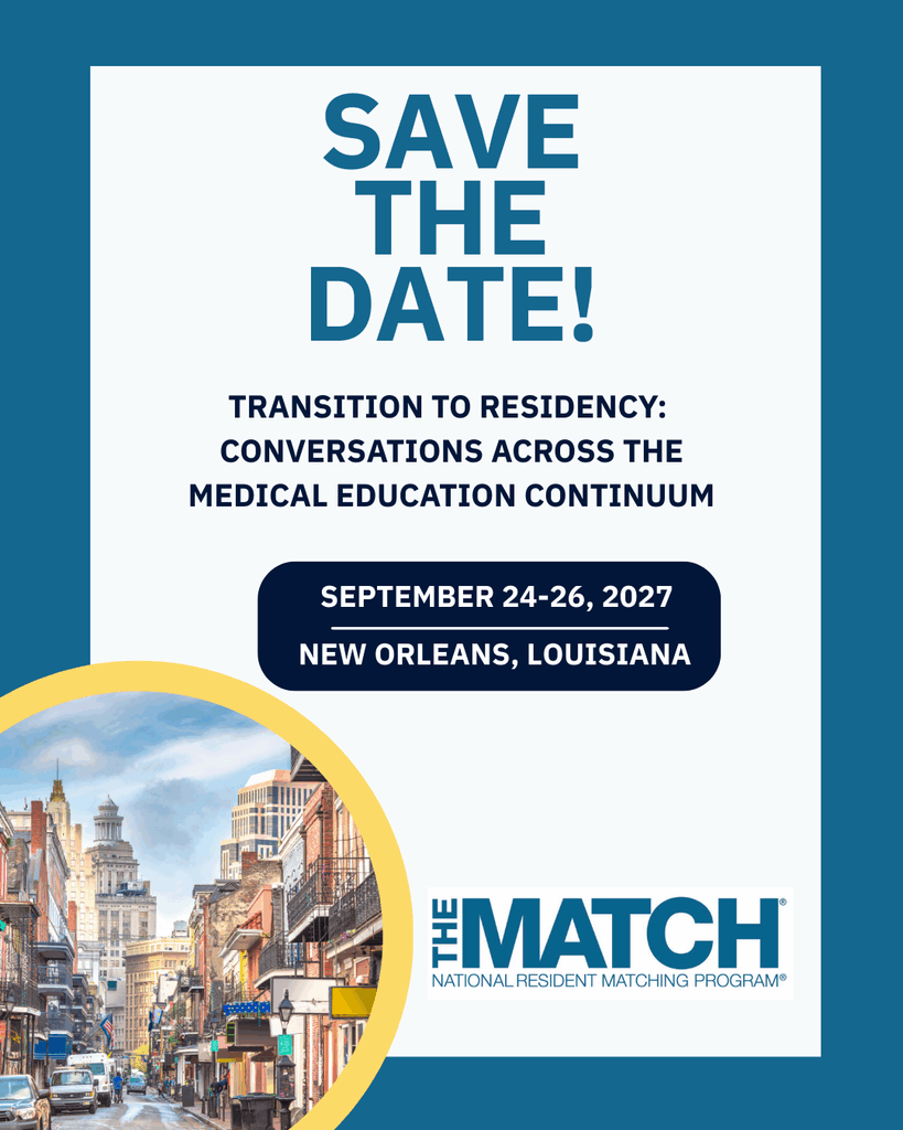 NRMP is excited about and hard at work on new initiatives for 2026. To allow time and space for those projects, we are planning to host our next Transition to Residency meeting in 2027. Please mark your calendars for September 2027 when we look forward to reconvening the community, this time in New Orleans, Louisiana!